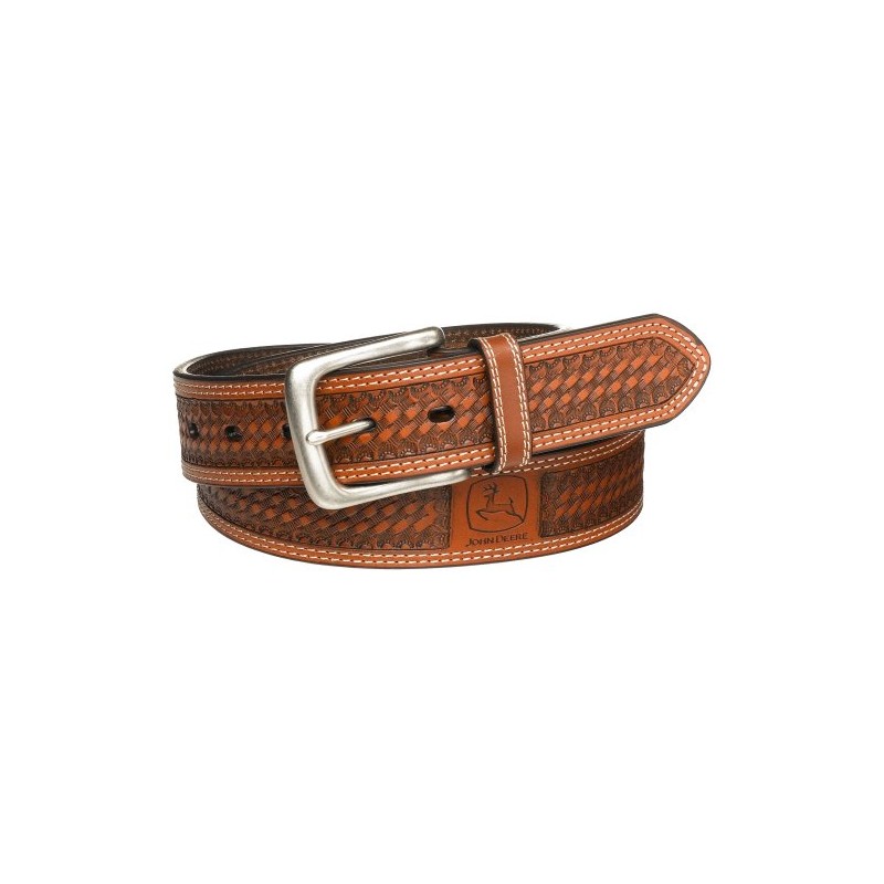 - Belt in bridle leather featuring basket-weave texture and single-prong buckle in silver-tone finish