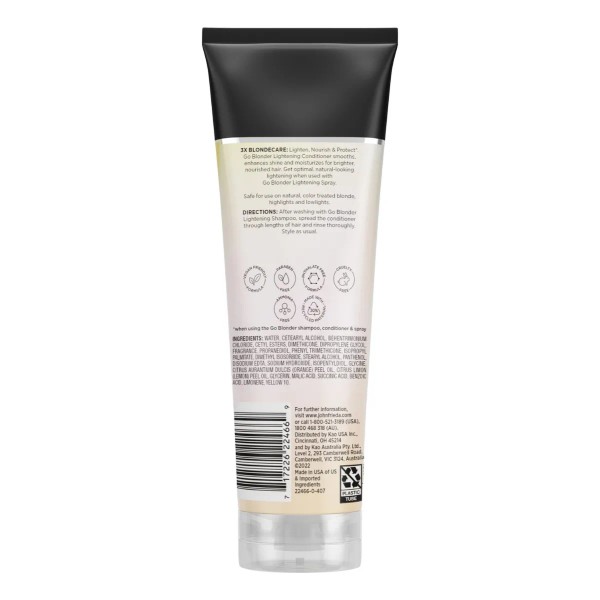 Más claro y más brillante sin secar tu cabello. John Frieda Sheer Blonde Go Blonder Acondicionador Aclarador restaura la humectación del cabello rubio mientras ilumina gradualmente a un rubio besado por el sol. Usa a diario con el Shampoo Sheer Blonde Go Blonder, para un aclarado óptimo y para dejar tu cabello sintiéndose tan bien como se ve.