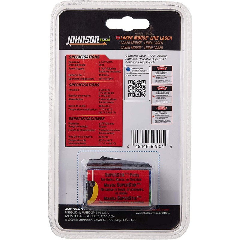 The Johnson Level Hot Shot Laser Mouse adheres to any surface for hands free use and can project a laser line up to 30 feet. Features built-in horizontal and vertical leveling vials. Laser Beam Color: Red, Accuracy: ±1/2 in. at 20-Feet. (±2mm at 1m), Beam Type: Line, Beam (qty.): 1, Laser Output: <=1mW, Interior Range (ft.): Up to 30, Mount Type: Super stick adhesive system, Battery Type: AA, Dimensions L x W x H (in.): 4 5/16 x 2 1/2 x 1 3/4, Battery Included: Yes, Case Included: Yes, Class Rating: Class II, Laser Wavelength: 635nm ±10nm, Leveling Type: Manual, Working Temperature: 14deg F to 113deg F.