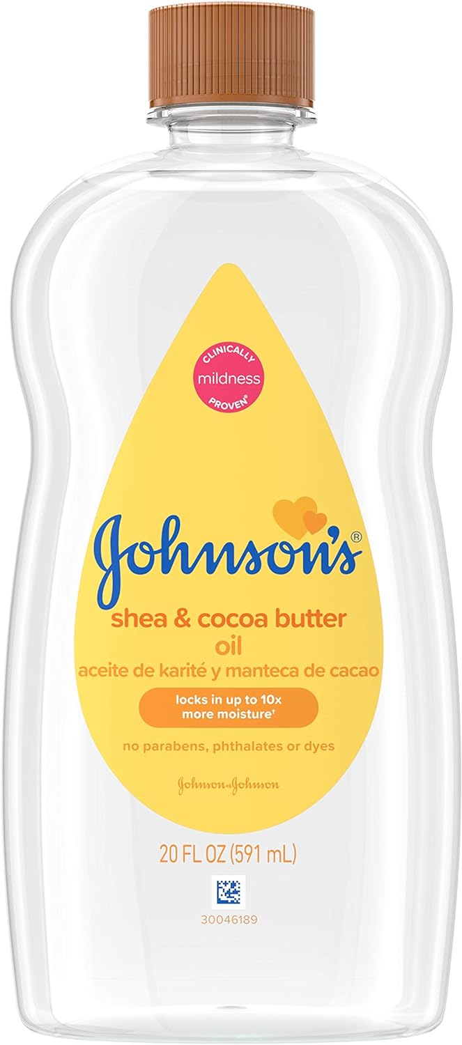 20-fluid ounce bottle of pure baby oil, enriched with shea & cocoa butter, formulated to help moisturize babies' delicate skin, and protect skin from dryness, great for relieving dry skin or rough patches