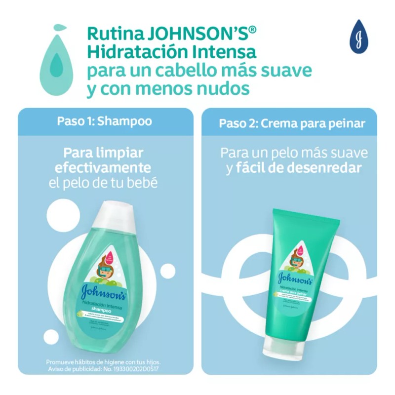 Los resultados serán aún mejores si se complementa con los productos de la línea Johnson's Hidratación Intensa: Shampoo + Acondicionador + Crema para peinar. Uso recomendado en niños desde los 2 años de edad en adelante. *vs Johnson's® baby acondicionador.