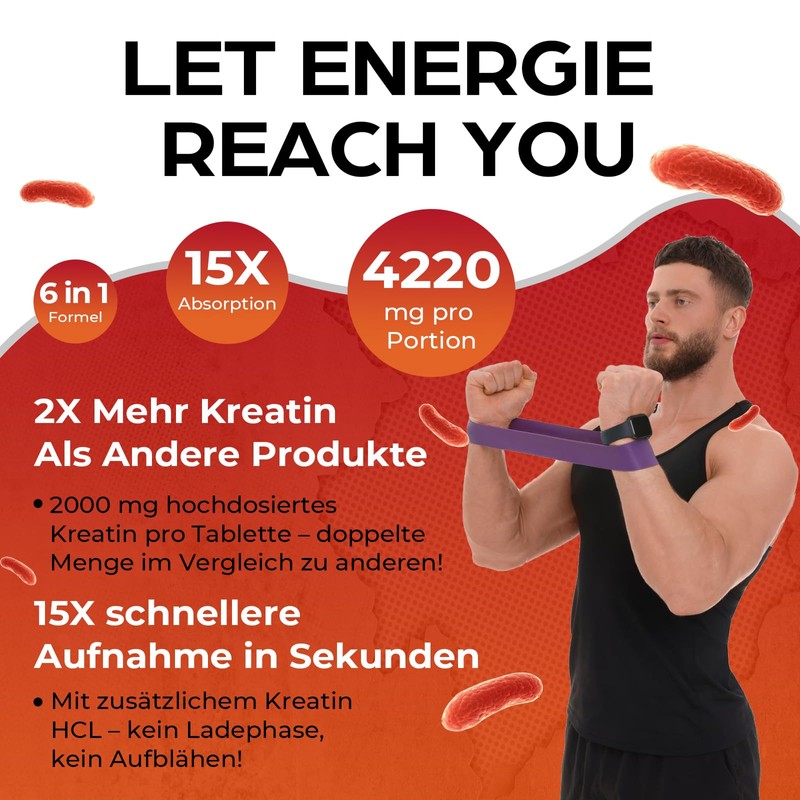 - berlegene Formel fr H?chstleistung: Kreatin allein reicht nicht! Unsere Kreatin Tabletten enthalten eine professionelle Mischung aus kreatin monohydrat und Kreatin HCL, erg?nzt durch 4 wichtige Elektrolyte. Diese einzigartige 6-in-1-Formel bertrifft herk?mmliche Kreatinpr?parate, sorgt fr schnelle Aufnahme und maximale Wirkung ohne Ladephase oder Magenbeschwerden. Damit kannst du beim Sport voll durchstarten und dich selbst bertreffen.