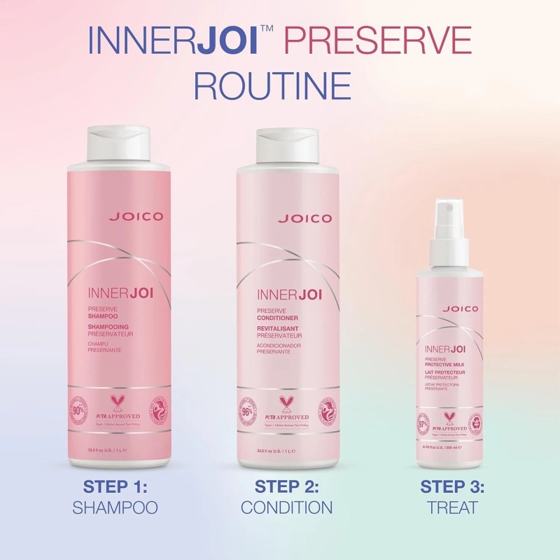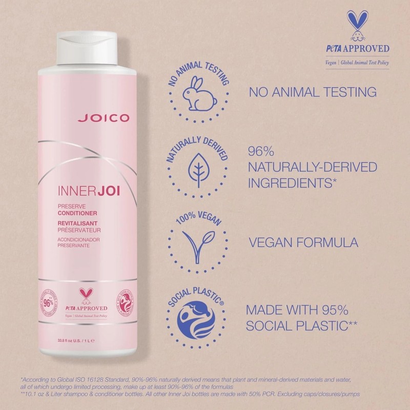 Keep your color-treated hair vibrant, soft, and healthy with Joico InnerJoi Preserve Conditioner, a color-protecting, nourishing formula made with 96% naturally-derived, vegan ingredients. Designed to maintain vibrancy and shine while promoting overall hair health, this gentle conditioner leaves strands feeling silky, smooth, and full of life.