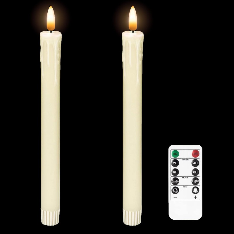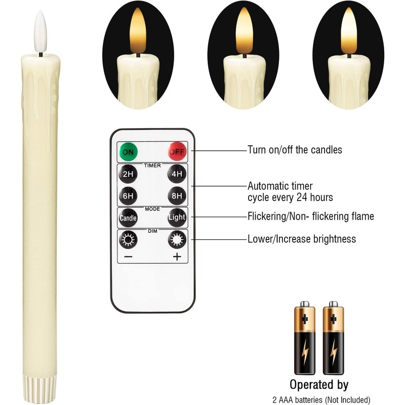 - 🔥WHAT YOU GET: 2pcs ivory taper candles (9.64 inch high x 0.78 inch diameter) with 1 10-key remote control and one user manual. Each flameless taper candle is powered by 2AAA batteries(Not Included), enough for working throughout the party or daily using. About the pack, we have placed extra paper wrapped each candle to prevent scratch and using strong styrofoam to protect these real wax candles from being damaged in transit.
