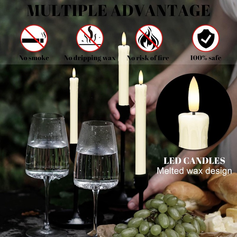 - 🔥IDEAL DECORATIONS: These taper candles are a great alternative to real candles, they can be placed in your favorite lanterns, sconce, the fireplace, windowsill, table centerpiece, bedside table, porch, garden and anywhere you might want to put them. Flameless flickering candles also can be widely used in evening parties, wedding, birthdays, Easter parties, Halloween, Thanksgiving, Christmas.