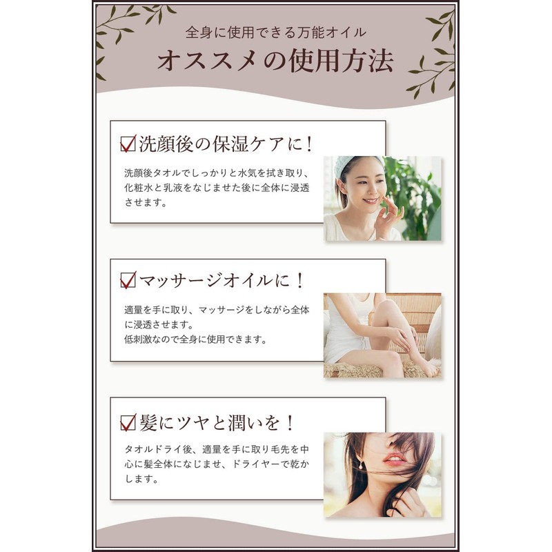 - Recommended Use: 1. For moisturizing care after washing your face. After washing your face, thoroughly wipe the water and let the lotion and emulsion penetrate throughout. 2. Massage oil. Take the right amount of hand and let it penetrate throughout the whole body while massage. Slowly rub and loose. 3. For delicate zone oil. It can also be used for care in delicate zones (※ Please refrain from using if you are prone to allergic reactions); 4) Give your hair luster and moisturize. After taking a bath, wipe the hair with a towel, remove an appropriate amount and blend the hair to the center of the hair and apply a dryer. Manufacturer: Takeuchi Pharmaceutical Co., Ltd. Made in Japan