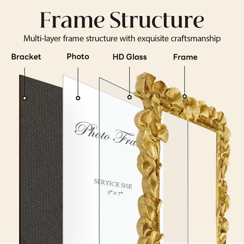 - DURABLE MATERIAL: 5x7 gold frame material is high-quality resin with smooth surface. It is very attractive and eye-catching. The floral picture frame uses high-definition glass. It is durable and of high quality. Provides you with a clear view. Perfect for home decor, office and wedding display