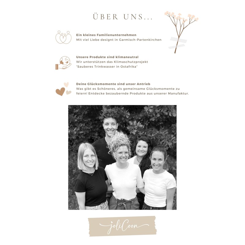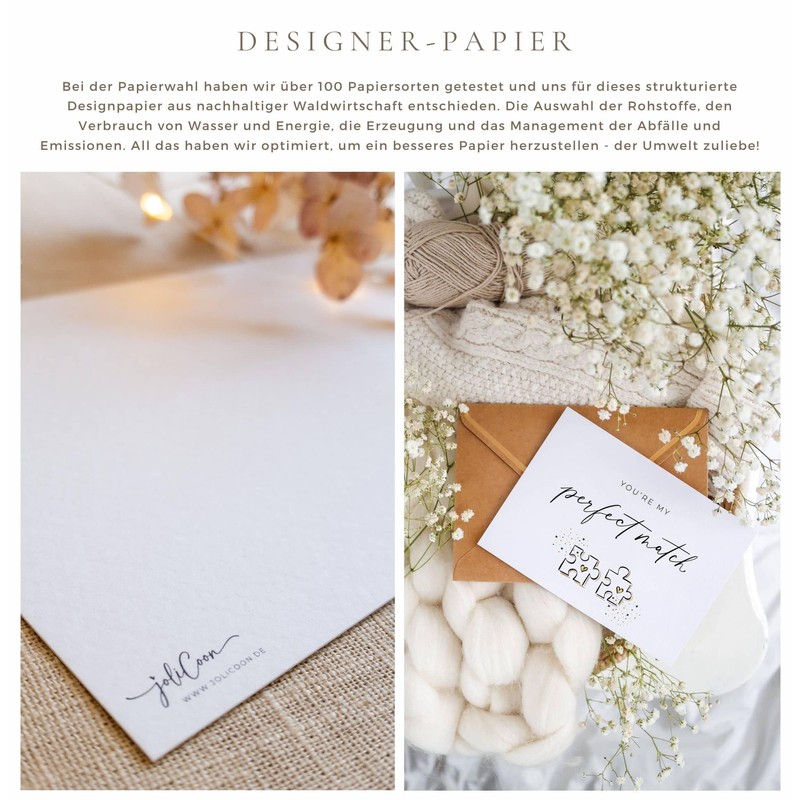 Your wedding day is just around the corner and you want a very special gift for your loved one? Then our You're my perfect match card is just the thing for you. Write down a few love words on the back of the card and ensure very special moments of happiness. The elegant surface structure ensures a soft feel and makes the wedding anniversary card something very special. Our You're my perfect match postcard adorns a delicate, gold-finished heart. The simple design makes it the perfect I love you gift for men or as a wedding anniversary gift for women. As a great couple gift, our You're my perfect match card as well as the envelope are produced in a climate-neutral way - for the sake of the environment. We are JoliCoon, a young family business close to Garmisch-Partenkirchen :) With the highest passion, dedication and care, we work every day to supply you exclusively products of the highest quality. Because only the best is good enough for very special moments. If you have any wishes or questions about our products, do not hesitate to contact us. Wir sind immer für Dich da!