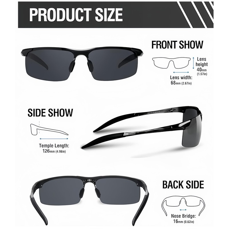- 1.TAC Polarized HD Lenses with UV400 Defense – Equipped with impact-resistant TAC polarized lenses, these sunglasses eliminate glare and restore true color vision while blocking 100% UVA/UVB rays. Ideal for driving, cycling, and high-speed sports.