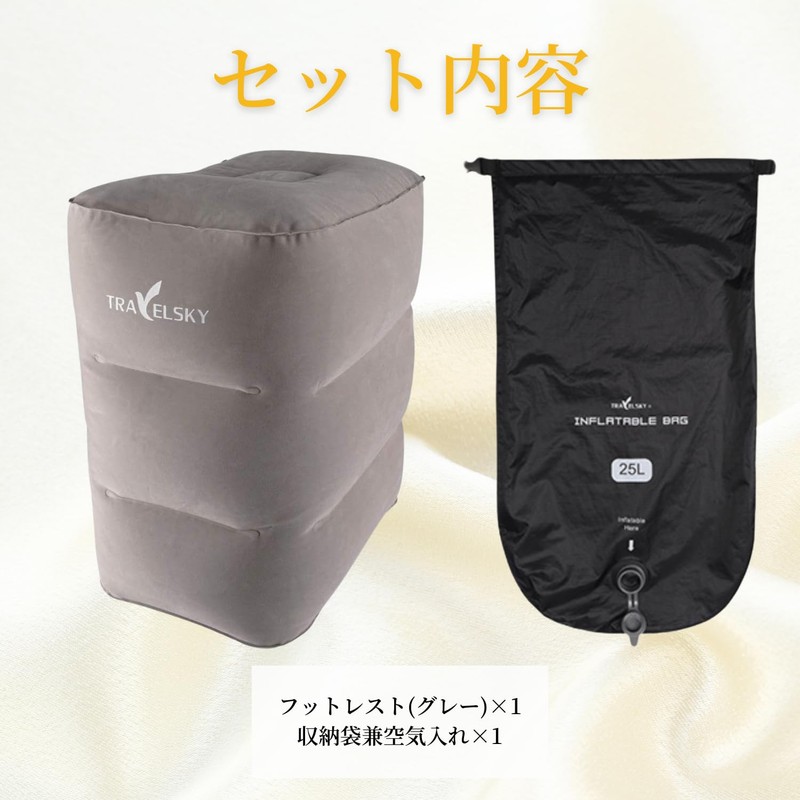 この商品は、足を伸ばして疲れを軽減するためのエアークッションです。収納袋とポンプが一体化しており、収納袋を空気で膨らませることで簡単に膨らませることができます。直径4cmの大口径エアバルブが付いているため、空気を吹き込むのも楽です。空気漏れ防止弁がついているため、安心して使用できます。この商品は、飛行機、車、電車、夜行バス、新幹線などの足置きとして、または子供用ベッドとしても使用できます。製品は、安全で非毒性である植物性PVCを使用しており、肌触りがよくベタつきません。製品に問題があった場合は、返金または無料交換が可能です。セット内容には、エアークッション、一体型収納袋が含まれています。
