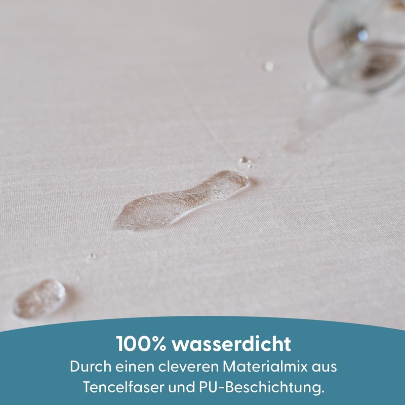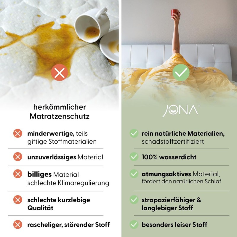 - Waterproof protective layer: you can rely on that. Thanks to a high-quality PU protective layer, the Jona mattress protector is 100% waterproof and reliably protects against sweat, urine, mites or bacteria.