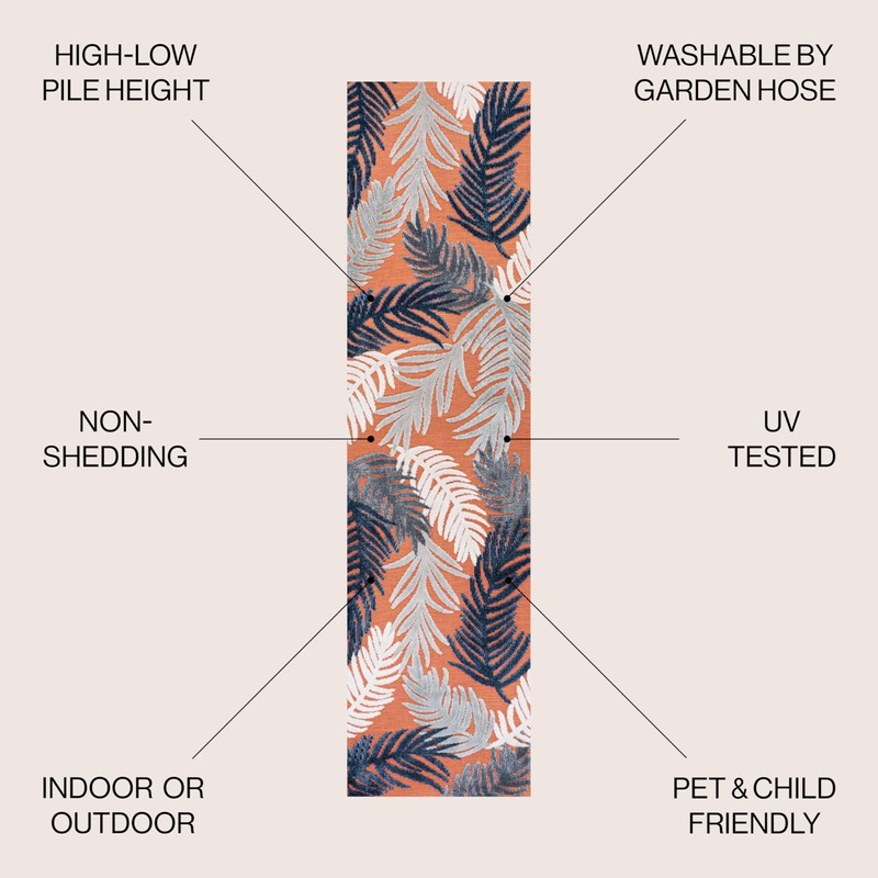 JONATHAN Y HWC101A-28 Montego High-Low Tropical Palm Indoor/Outdoor Area Rug, Floral, Coastal, Country, Backyard, Patio, Porch, Easy-Cleaning, Non-Shedding, 2 X 8, Orange/Navy/Ivory