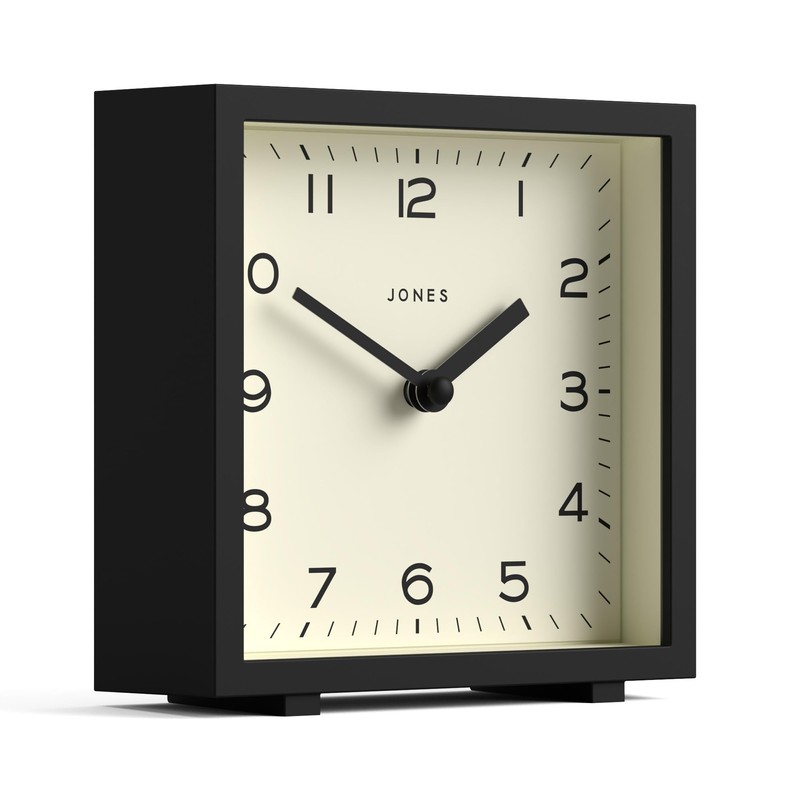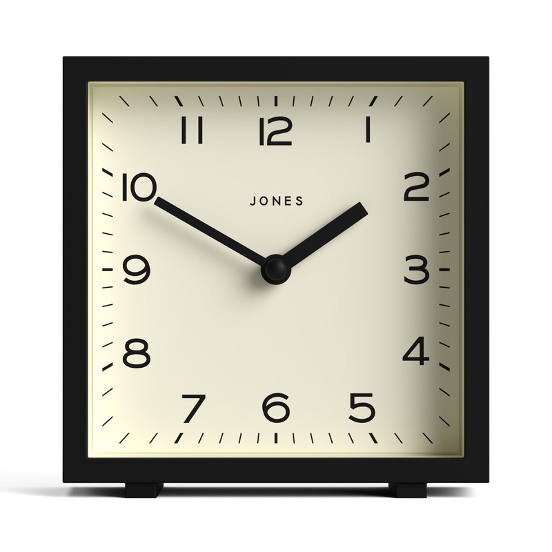 JONES CLOCKS® 'Disco' desk clock – sleek square design in black, stylish and easy to read for shelf, table, mantel or bedside