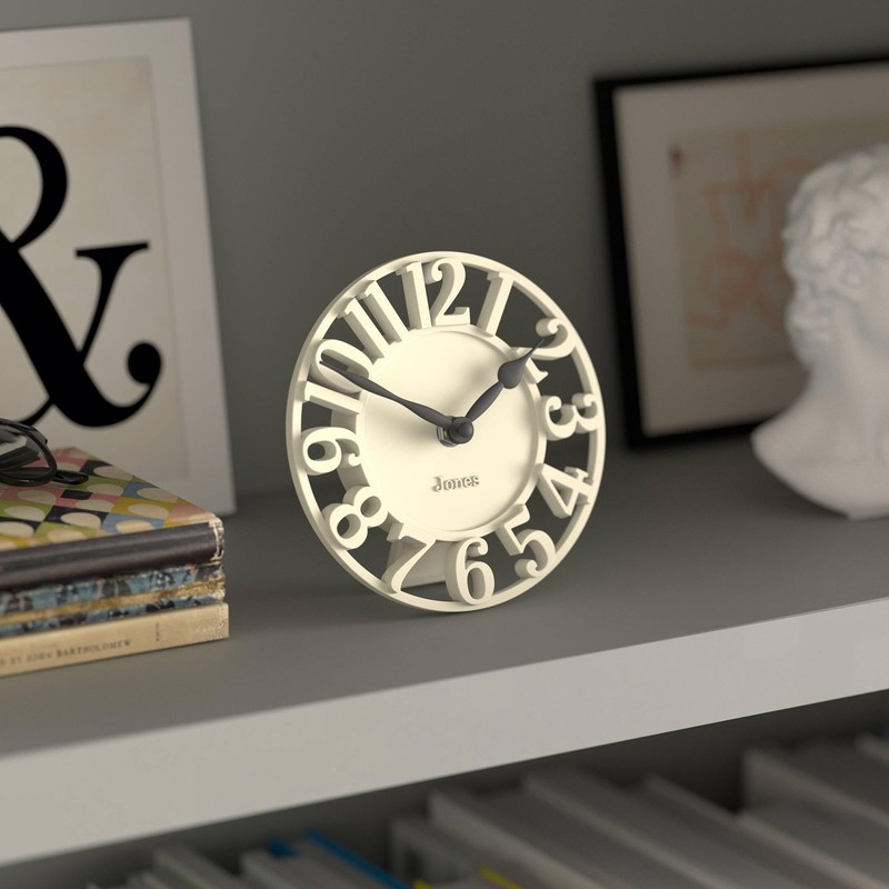 Jones Clocks® Ealing desk clock | Mini skeleton clock | Pale cream | Freestanding contemporary mantel clock with cut out numbers for shelf, table, mantel or bedside