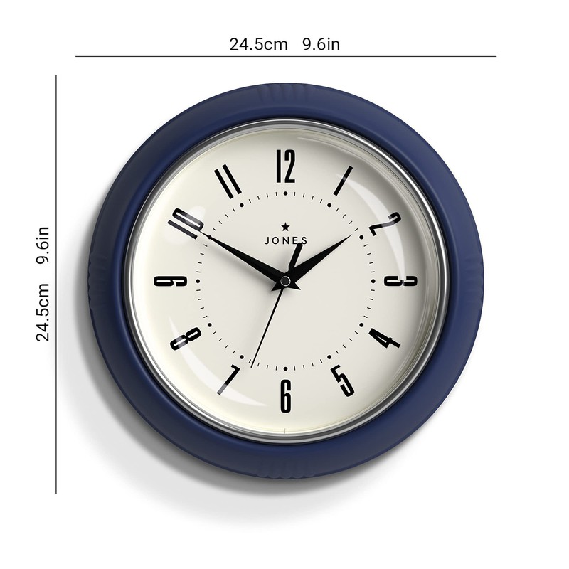 Jones Clocks® Round Retro Wall Clock – The Ketchup Round Clock – Easy to Read Numbers, Blue wall clock perfect as a kitchen clock, office clock, living room clock. Retro clock 25cm