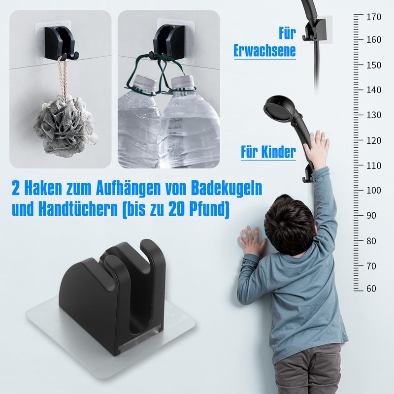 - ????Humanisiertes Hakendesign??: Unsere duschkopf halterungen sind mit einem ergonomischen 2-in-1design angenommen. Zus?tzlich zur Befestigung des Duschkopfes, kann es auch als Haken verwendet werden. Die 2 Aufh?ngehaken dieses brausehalterung dusche erm?glichen es Ihnen, Badezimmerzubeh?r wie Badeb??rsten, Handt??cher, Badekugeln, etc. leicht zu h?ngen. Zur gleichen Zeit der effizienten Lagerung, wird es auch mehr bequem und spart mehr Platz.