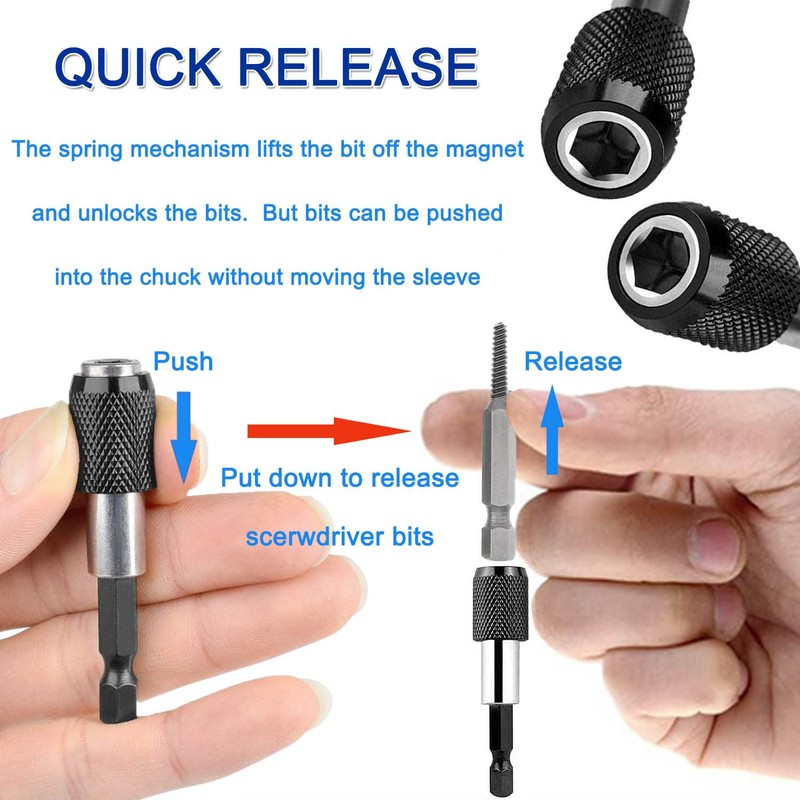 - QUICK RELEASE - The quick change and release design for quickly lock and unlock the bit easily. 3 different length drill bit holder (2.3/4/6 inch) to meet your various needs