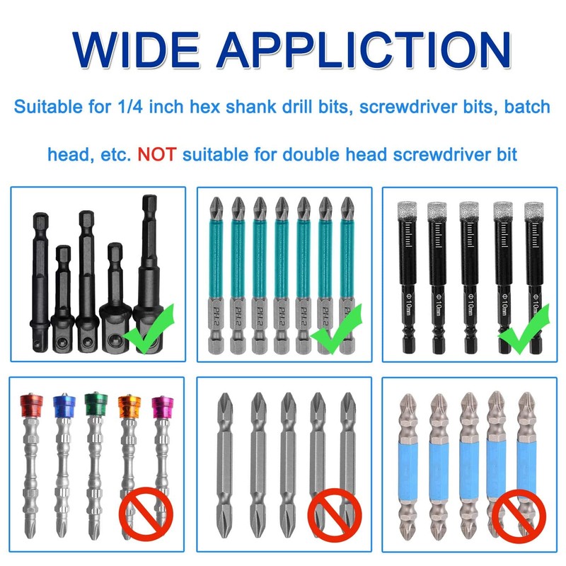 - WIDE APPLICATION - Suitable for 1/4 inch hex shank drill bits, screwdriver bits, batch head, socket adapter,etc. NOT suitable for double head screwdriver bit