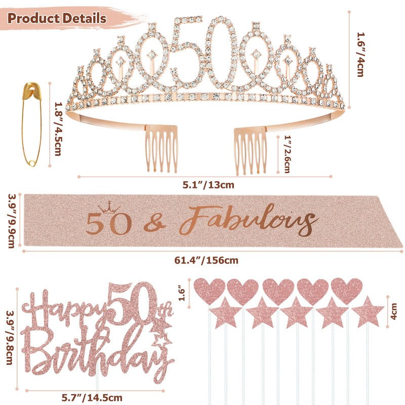- 50th birthday gifts for women: This kit contains a glittering rose gold birthday sash, a 50th rhinestone tiara, a golden pin, a happy birthday cake topper, 5 star cupcake topper and 5 heart cupcake toppers. No need to spend a lot of time searching for separate birthday decoration accessories, we prepare all for you! It is such a great 50th birthday gift for women birthday!