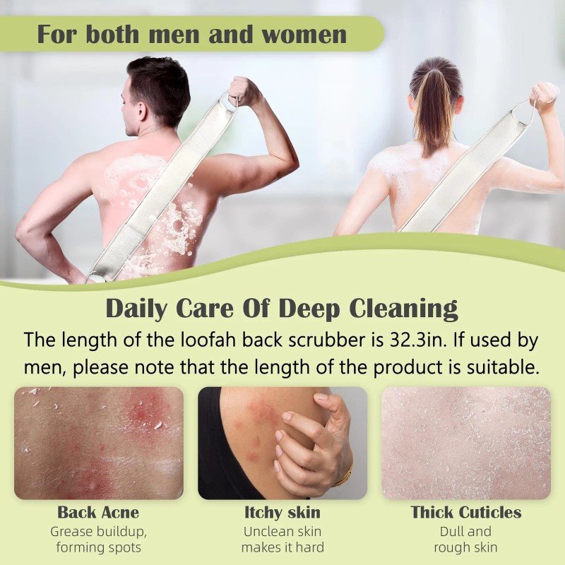 【SIZE DESCRIPTION】 Our loofah sponge exfoliating body scrubber is made from high-quality 100% natural loofah and towel cotton material. Measuring at 32.3 inches in length and 4.0 inches in width, is specifically designed to reach and cleanse those hard-to-reach areas on your back, and handles on both ends, making it easy to reach and clean those hard-to-reach areas of your back.