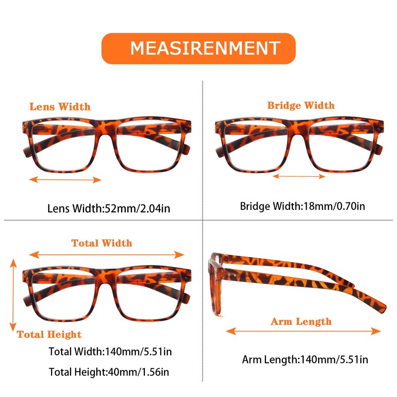 - Oversized lens frame, interesting and colorful design, fresh appearance. Give you the guarantee of reading throughout the day. Square reading glasses with spring hinges. The lenses are about 1.57 inches (40 mm) tall and 2.04 inches (52 mm) wide.