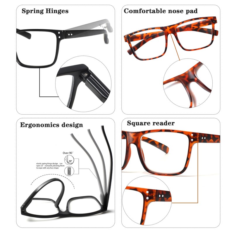 - For increased durability, JOSCHOO reading glasses are made with high-quality lenses, high-quality spring hinges and pressure-resistant, wear-resistant plastics. You don't have to worry about "loose screws," "loose hinges," or "frame damage." These reading glasses are strong enough to withstand the wear and tear of everyday use.