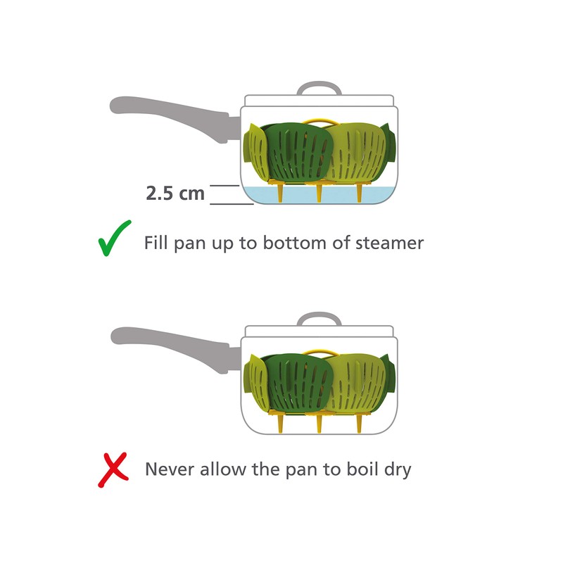 - The steamer's self-adjusting sides allow it to fit a variety of pots and pans. Minimum pot diameter 7 inches. Features an easy-lift fork hook.