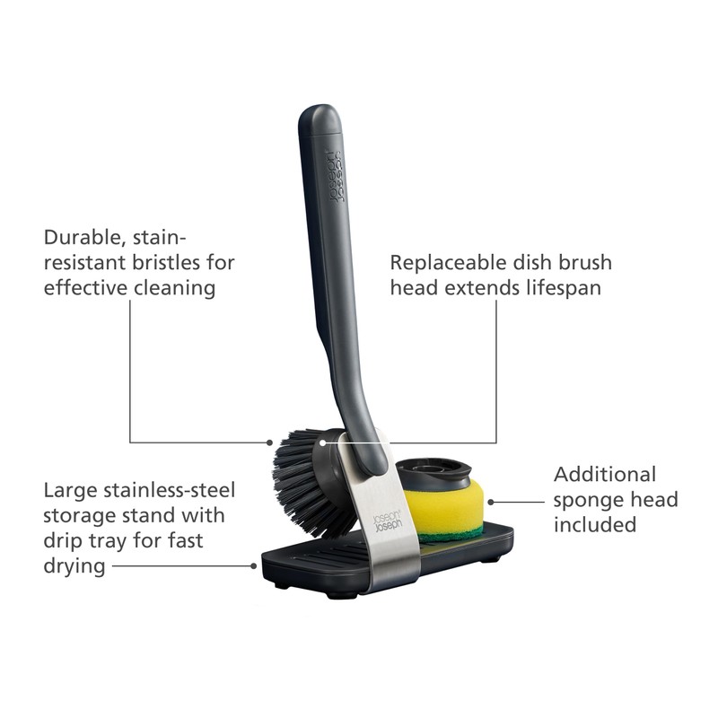 Joseph Joseph SinkTech Dish Brush and Sponge Set with Large Stainless Steel Storage Stand, Durable Bristles, Replaceable Heads