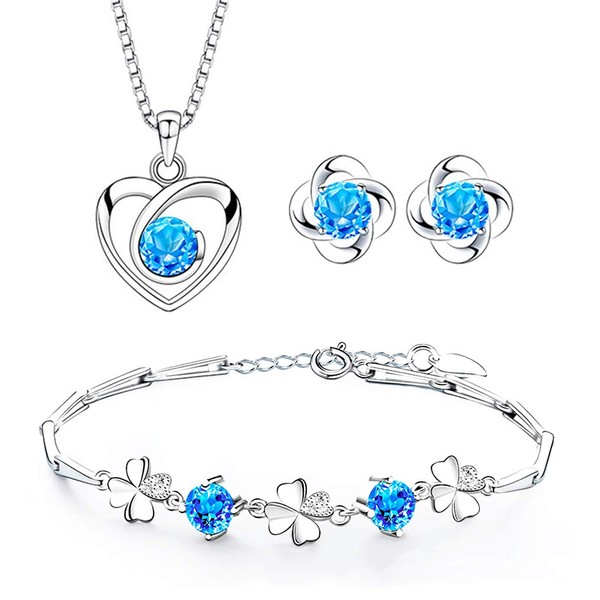 Josfeva Silver Jewellery Sets for Women, 925 Sterling Silver Stud Earrings & Necklace & Bracelet Sets with Blue Cubic Zirconia, Heart Clover Jewellery Set Gift for Christmas Birthday Valentines