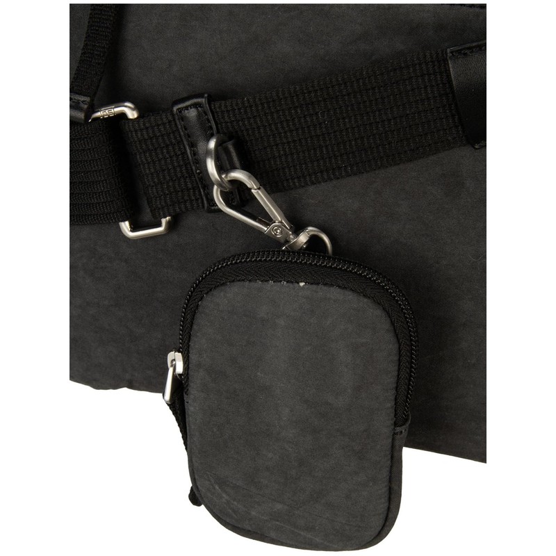 On the back 1 carabiner hook for shoulder straps and 1 flap with press stud for shoulder straps.