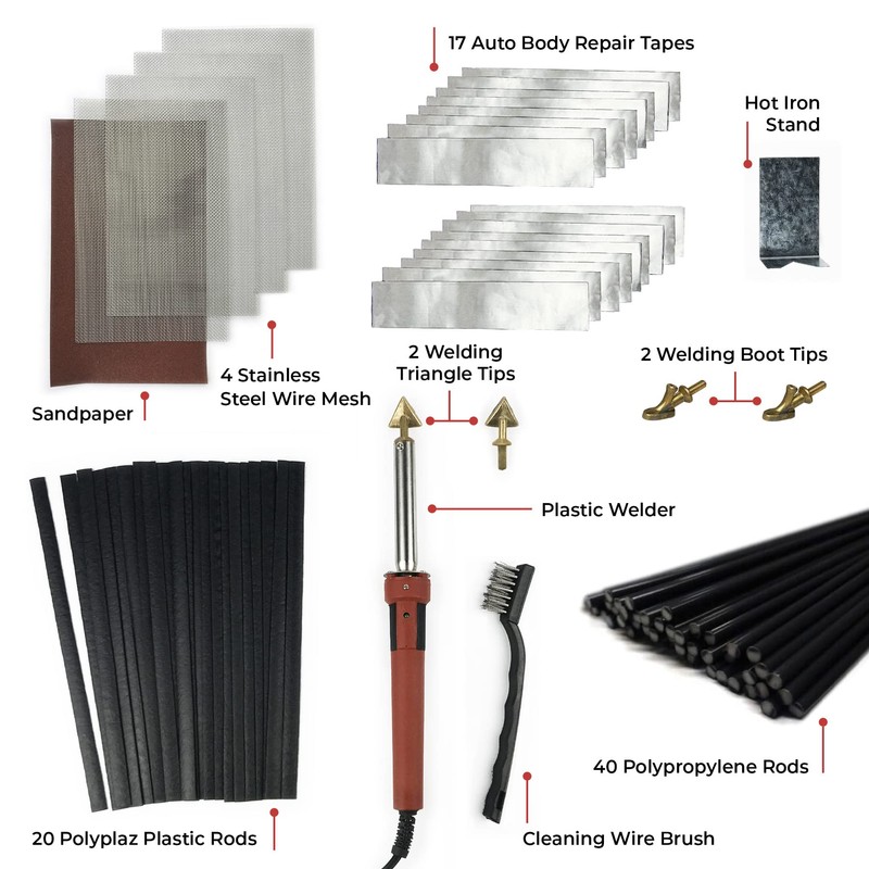 - Deluxe Welding Kit Includes Everything You Need - 17 Pc Aluminum Repair Tape, Sandpaper, 20 PolyPlaz Rods, 40 PP Rods, 2 Triangle Welder Tips, 2 Welder Boot Tips, 4 Reinforcing Stainless Steel Wire Mesh, 1 Iron Stand, 1 Wire Brush