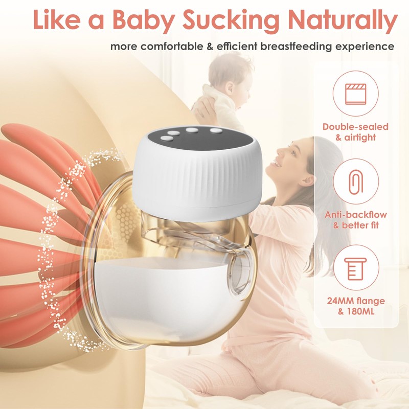- [Hands Free & Portable] Unlike manual breast pumps, our hands free breast pump has no external hoses and cables, which really makes your hands free. While pumping milk, you can work, read, do yoga and do other activities, which is very suitable for use at home and on the go. The electric breast pump weighs only 190 grams and via the LED indicator and simple buttons you can adjust the suction strength in real time, making breastfeeding easy and efficient.