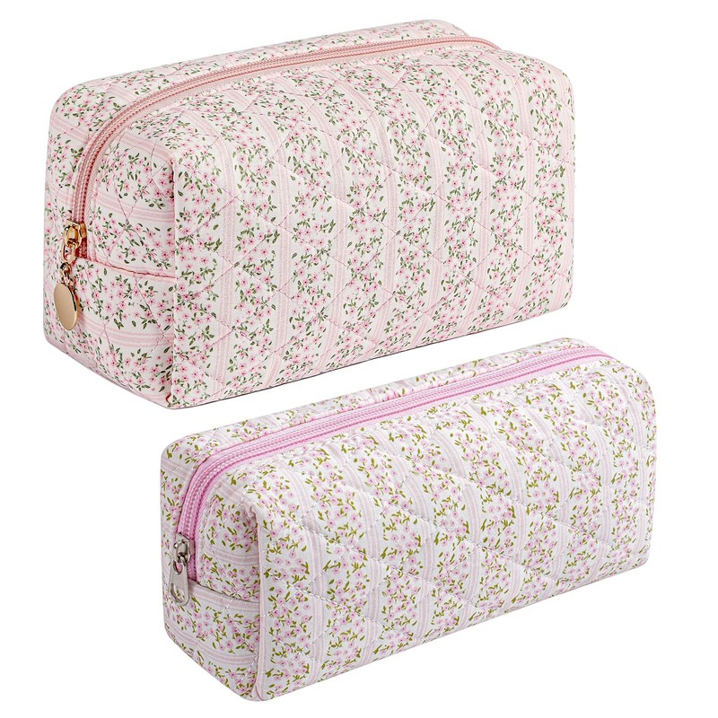 JOVAKIT 2Pcs Makeup Bag Quilted Cosmetic Bag for Women Girls, Floral Coquette Cotton Toiletry Zipper Make Up Pouch, Travel Storage Organizer Pouch (Pink Floral)