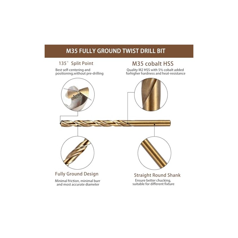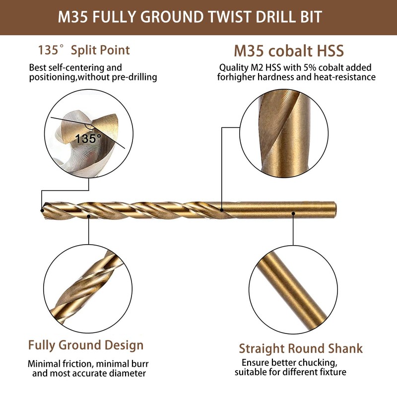 - 【Material】It is made of HSS high speed steel. This cobalt drill is well made and has a high hardness of HRC64, durable. It can drill concrete, wood, plastic and other materials with ease.