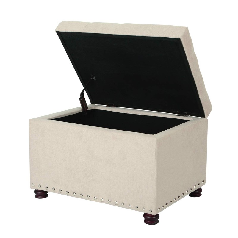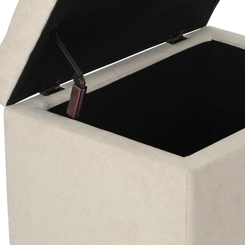 - Extra-padded top lid hinges open to reveal storage space inside—great for throw pillows and blankets
