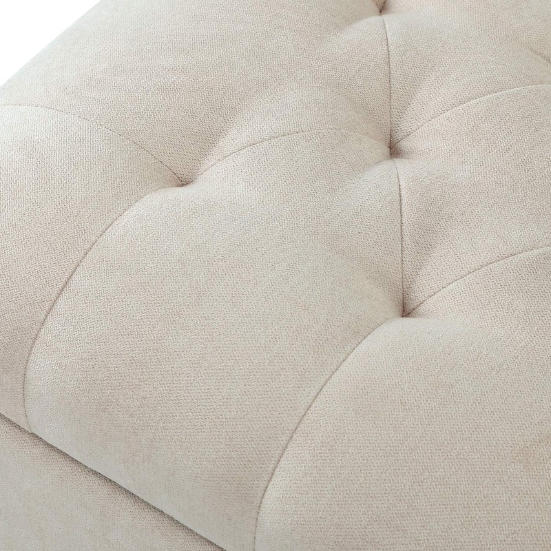 - Fabric upholstery with button tufting on top; solid-wood round bun feet for stability.