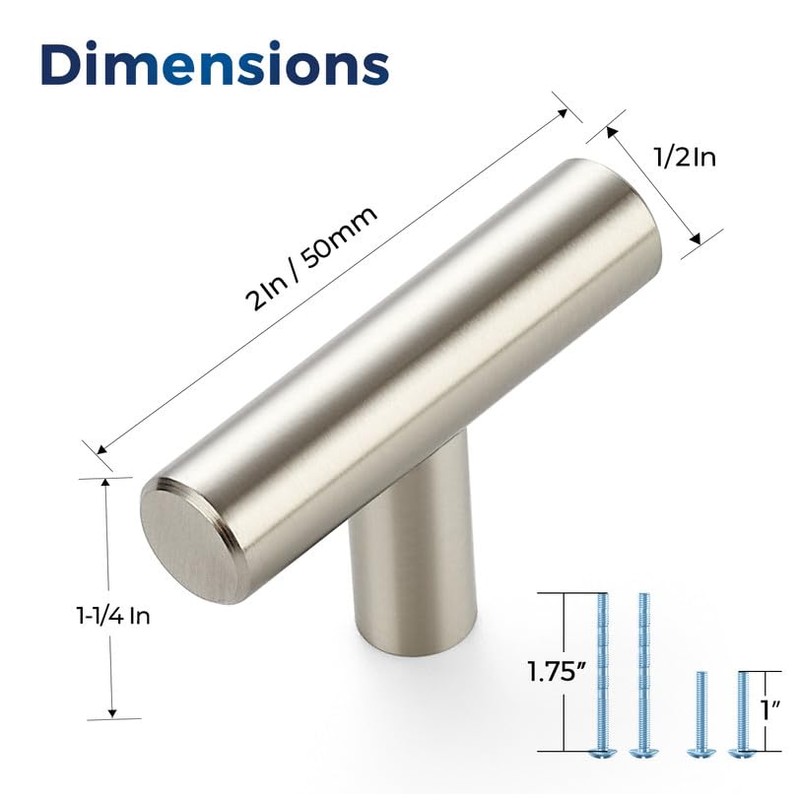 Easy Installation: Our brushed nickel knobs offer two sizes (1" and 1-3/4") of M8-32 metric size machine screws. They fit most cabinets and are easy to install.