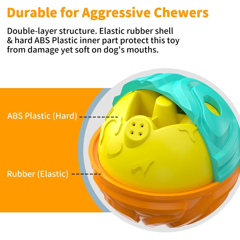 - Dog Chew Toy for Aggressive Chewers - This is a Long-lasting dog rubber toy that dog owners are looking for! It features a double-layer structure with an elastic rubber shell and a hard ABS plastic inner part. With double protection, it can withstand the strong bite of heavy chewers and satisfy your dog's chewing instincts. Some feedbacks said 'Almost no bite marks or cracks after months of use'.