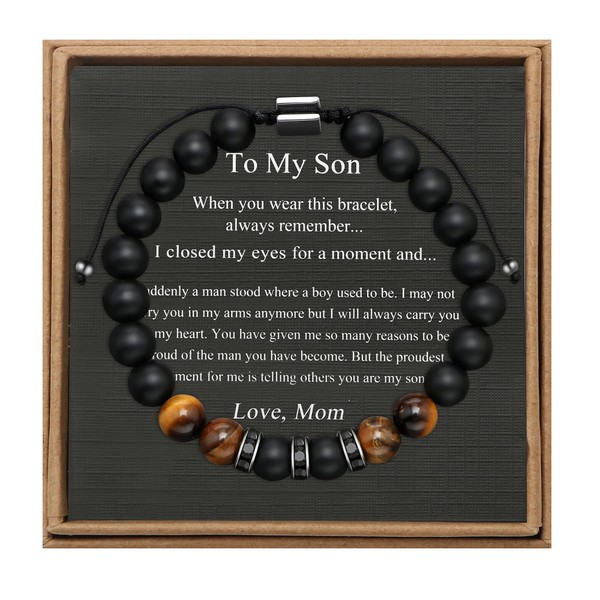 JoycuFF Son Bracelet Gifts from Mom, Birthday Father's Day Thanksgiving Day Christmas Gifts for Son, Adjustable 8mm Mens Tiger Eye Black Matte Agate Bead Bracelets for Him