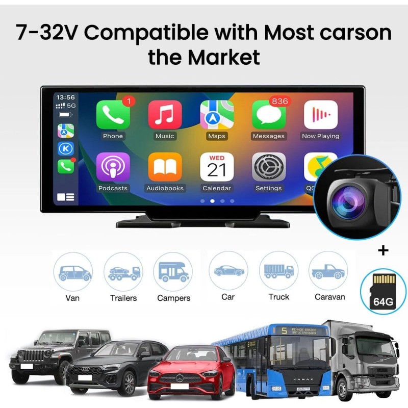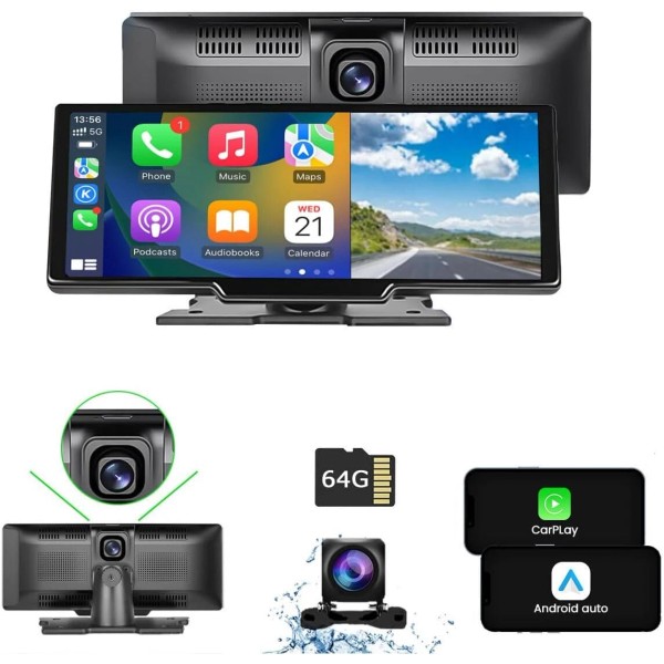 • Features: Touchscreen, Voice Control, Carplay and Android Auto, Front and Rear camera, 64G TF card, Bluetooth
