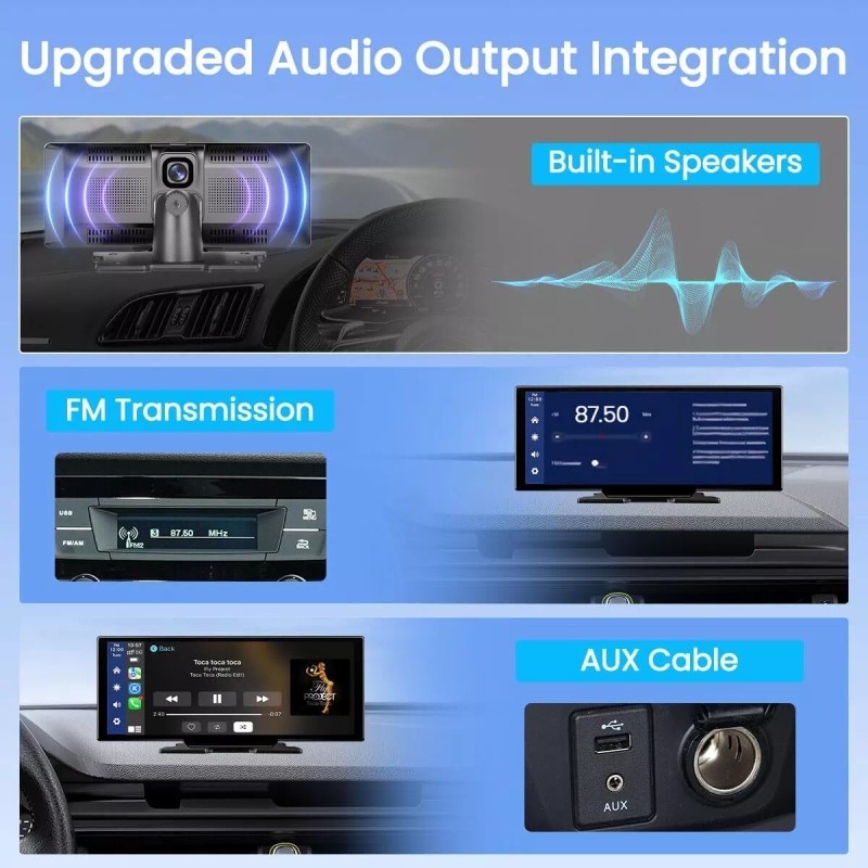 【AUX / FM Transmission】This portable carplay screen for car has built-in speakers, but for louder sound you can transmit audio to your car speakers by either FM frequency syncing or connecting the included AUX cable to your car's AUX input jack.