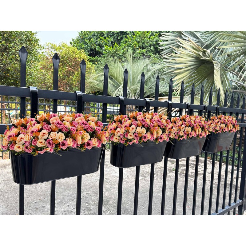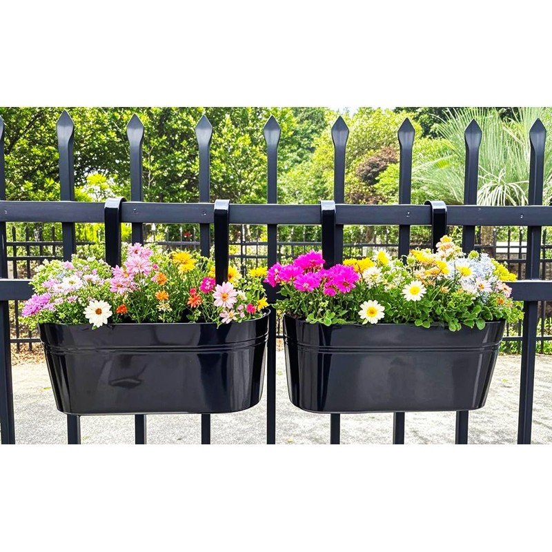 Transform your outdoor spaces with these hanging flower pots outdoor—durable, stylish, and designed for versatility. Each rail planter measures 17"x4.7"x5", made of rust-proof metal iron to withstand rain, sun, and wind. Available in 2/4/6/8 packs, they easily attach to railings, fences, or porch planter setups with removable hooks. Built-in drainage holes prevent root rot, ensuring healthy growth for flowers, herbs, or succulents. Ideal as flower planters outdoor or hanging garden planters, they blend sleek design with rugged functionality.
