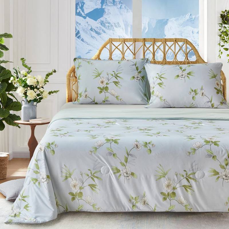 Joyreap Queen Size Cooling Comforter Set, White Flowers on Light Blue Design, Double Side Cooling Blanket for Hot Sleepers and Night Sweats, Lightweight Silky Smooth Bedding Set- 88x88 inches