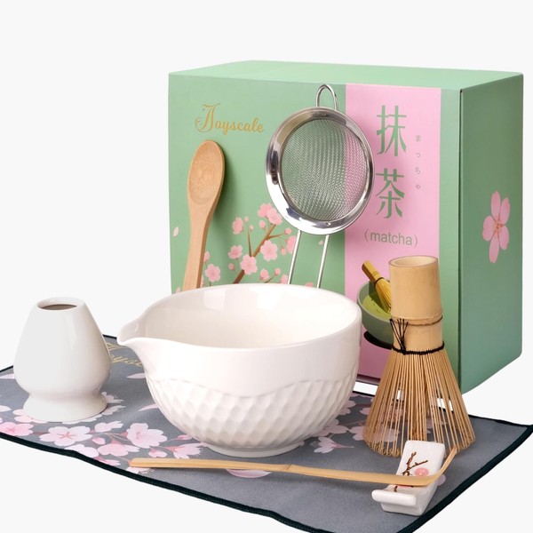 - Complete Macha Kit: The aesthetic japan matcha chawan bowl set includes 8 Pcs matcha tool: 1* ceramic chawan matcha bowl with spout 16 oz, 1*ceramic whisk holder, 1*bamboo whisk(chasen), 1* bamboo scoop(chashaku), 1*ceramic scoop holder, 1*stainless steel sifter, 1*tea spoon, 1* tea towel. It is a perfect matcha starter kit