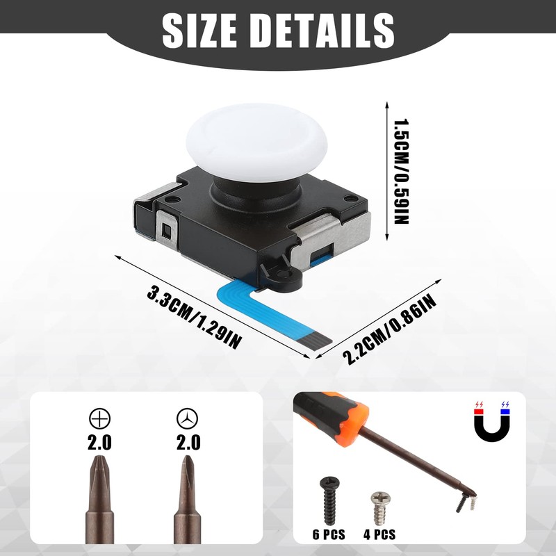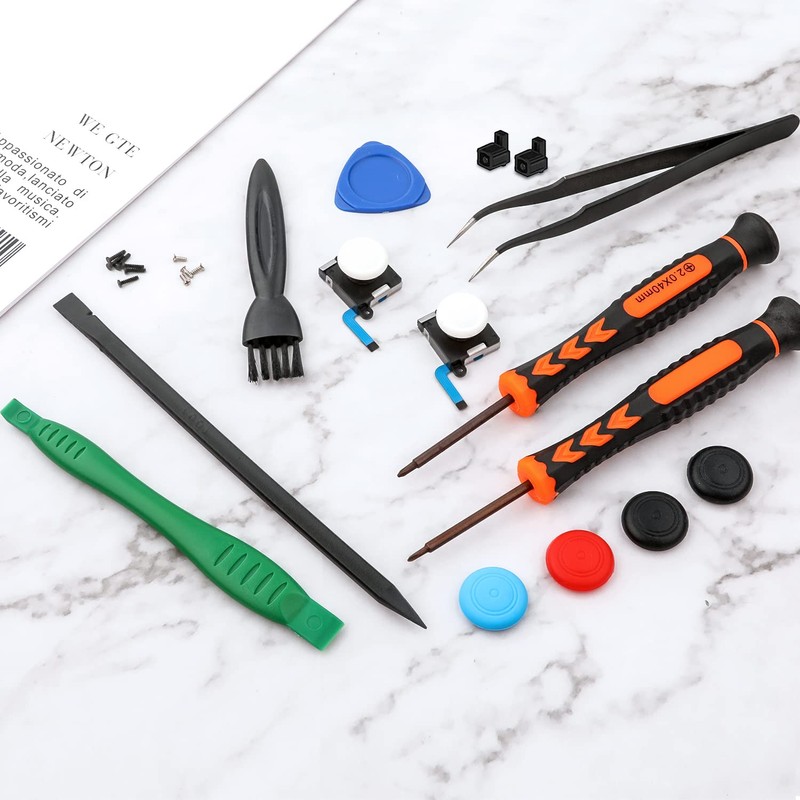- Package Content: You will get 1* triwing screwdriver, 1* cross screwdriver, 1* blue triangle paddle, 6* "Y" screws, 2* white replacement original joysticks, 1* tweezers, 1* cleaning brush, 1* pry tool, 1* plastic pen, 4* "+" screws, 2* replacement plastic