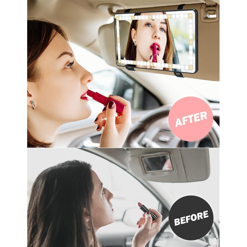 - [Dimmable Bicolor LED Lights] The car vanity mirror has 48 white lights and 12 yellow lights, which are 50% brighter and use 60% less energy than normal bulbs. Press the two sensor switches to switch between three light colors: bright white, warm white, and warm. 3000-6500K color temperature is equivalent to outdoor sunlight, so your makeup will look naturally flawless