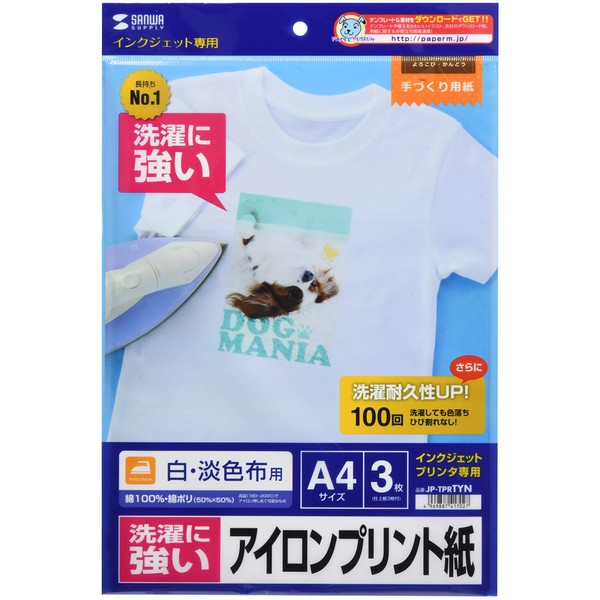 サンワサプライ インクジェット洗濯に強いアイロンプリント紙(白布用) JP-TPRTYN
