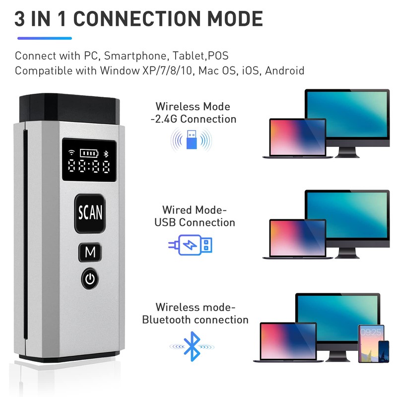 JRHC Escáner de código de barras Bluetooth, Mini lector de código de barras 2D 3 en 1 conexión portátil Qr Code Scanner con visualización TFT para POS, tabletas, iOS, Android, Windows, Mac, Smartphone
