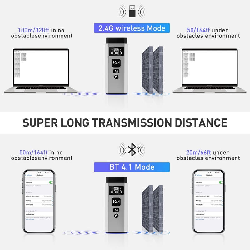 - Formas de conexión 3 en 1: puedes cambiar entre 2,4 G inalámbrico/Bluetooth/USB con cable tres tipos de modo de conexión más cómodo. También el escáner de código de barras Bluetooth JRHC ofrece una distancia de transmisión de hasta 30 m/98 pies en barrera última intervensión bajo el modo inalámbrico 2.4G, barrera de distancia de transmisión de hasta 50 m/164 pies última intervensión bajo el modo Bluetooth.