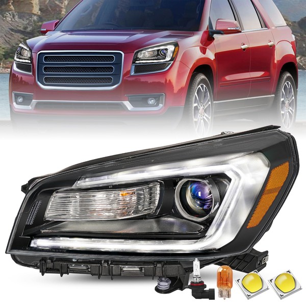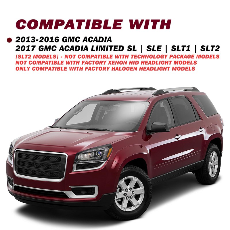 - 【VEHICLE COMPATIBILITY】Headlights Assembly Compatible with 2013 2014 2015 2016 GMC Acadia w/ Factory Halogen Type Headlight Models. Compatible with 2017 GMC Acadia Limited | SL | SLE | SLT w/ Factory Halogen Type Headlight Models. Compatible w/ Factory Halogen Type Headlight Models ONLY. Not compatible with factory HID models.[SLT2 Models] - NOT Compatible With Technology Package Models.